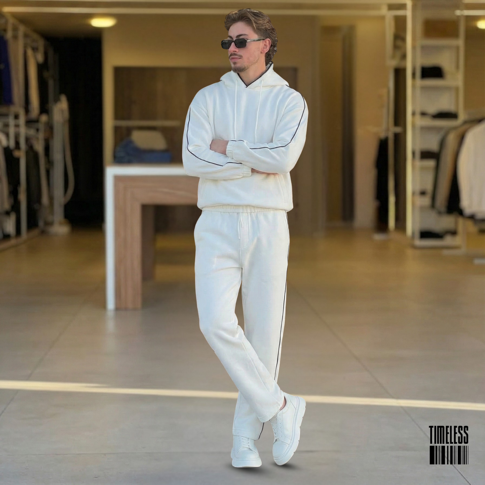Achieve a crisp and clean look with this standout white tracksuit. We designed this set for those who are not afraid to wear brighter colors and want a fresh aesthetic. The sharp black piping runs along the sleeves and legs to create a defined and modern silhouette against the bright fabric. It is the perfect combination of sporty style and relaxed comfort for your daily routine.