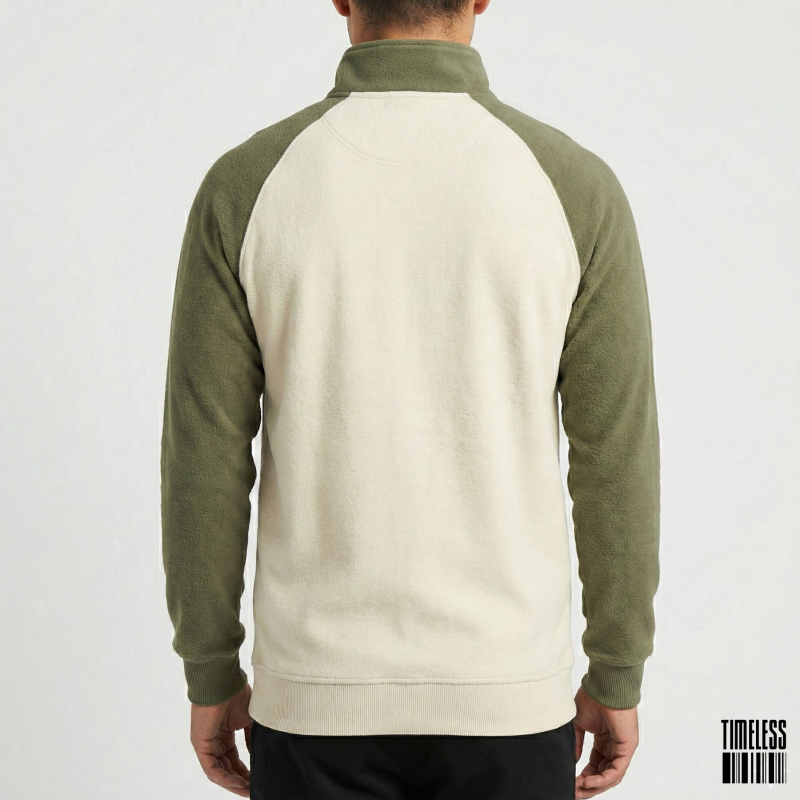 Design: Cream body with contrasting olive green raglan sleeves