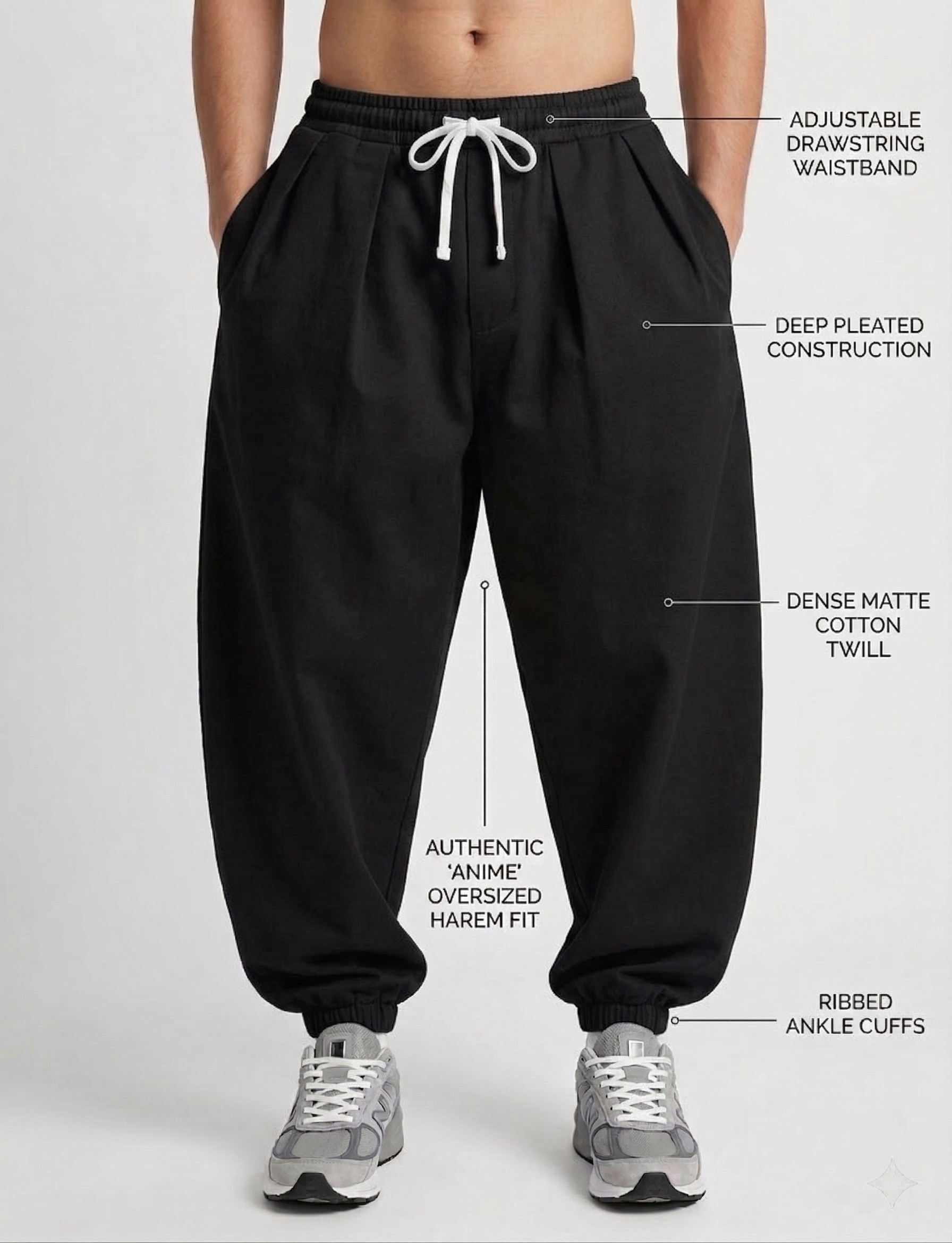 Fabric: Premium Soft Cotton Silhouette: Oversized Baggy Drop Fit Waist: Elastic Drawstring Pockets: Deep Side Pockets Finish: Ribbed Cuffed Ankles Colour: Midnight Black